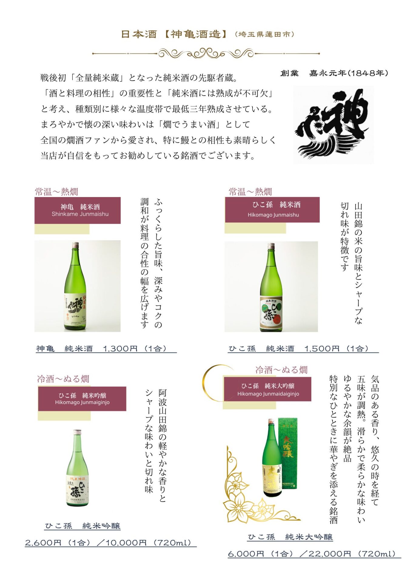 | ひこ孫 純米吟醸 | 2,600円(1合)/10,000円(720ml) |