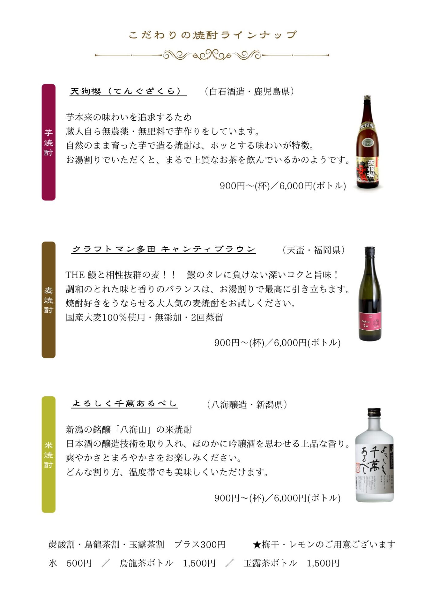 | 炭酸割・烏龍茶割・玉露茶割 | プラス300円 |